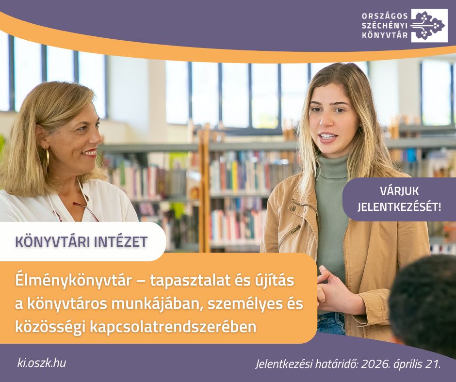 A Magyar Nemzeti Múzeum Közgyűjteményi Központ Országos Széchényi Könyvtár (felnőttképzési nyilvántartási szám: B/2022/000258), meghirdeti 30 órás engedélyezett továbbképzési programját Élménykönyvtár – tapasztalat és újítás a könyvtáros munkájában, személyes és közösségi kapcsolatrendszerében (IV/2225-3/2023/KONYVLEV) címmel.